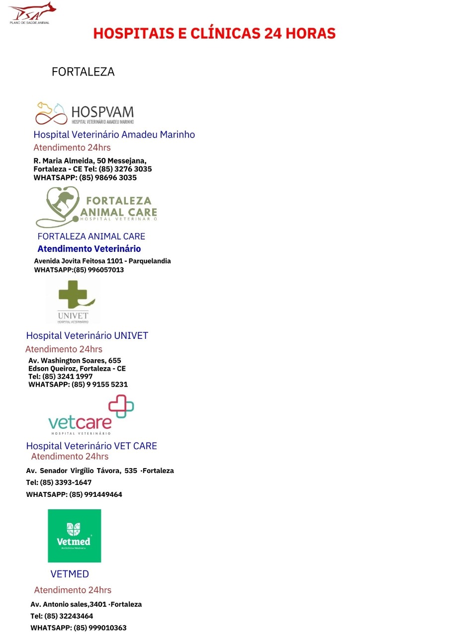 Disponibilizamos em Fortaleza, uma ampla rede de consultórios, clínicas, laboratórios e hospitais, além de possibilitar o reembolso das despesas médicas veterinárias e hospitalares, realizadas fora do Estado e exterior, garantindo tranquilidade em todas as situações, com coberturas completas, diferenciadas exclusivas do PSA.